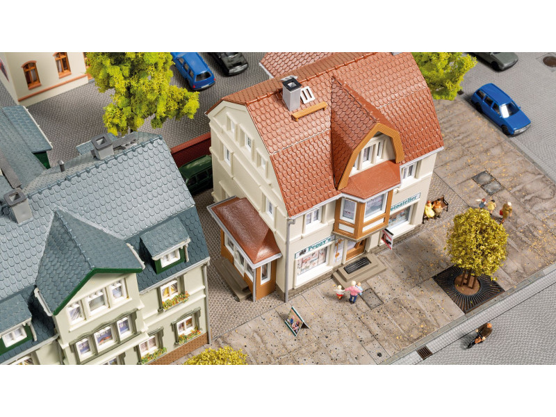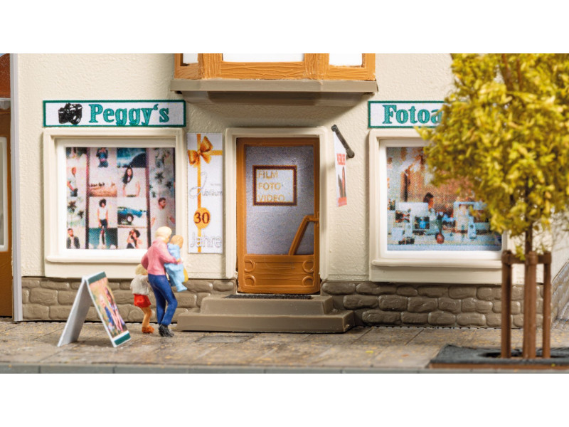 Typická obytná budova s obchody v přízemí, která okamžitě připomíná centrum města. Součástí jsou dekorace pro úpravy, ať už pro obchod s hodinkami a klenotnictvím, nebo pro fotoateliér. To umožňuje snadno přizpůsobit model vaší vlastní představě.