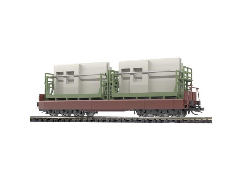 Nízkostěnný 6osý vůz Samm 4818, ložený regály s panely, DR, IV. epocha, TT, Busch 31655