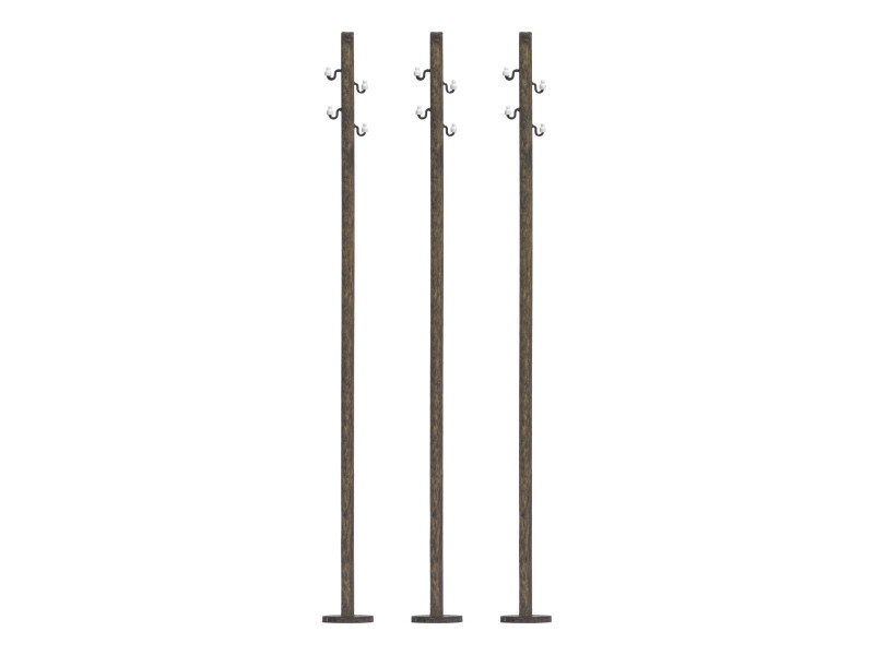 Tři rovné sloupy nadzemního elektrického nebo telegrafního vedení vyrobené z pravého dřeva s jemnými izolátory. Hotové modely.