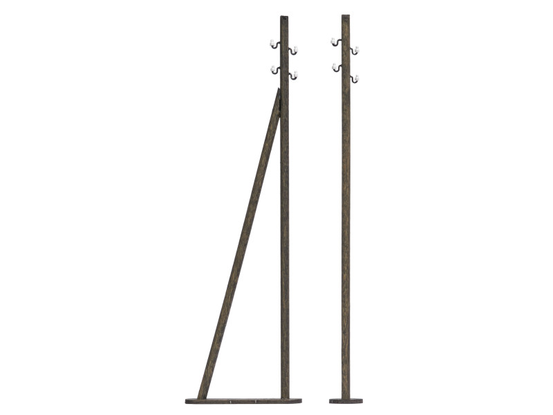 Tři rovné sloupy nadzemního elektrického nebo telegrafního vedení vyrobené z pravého dřeva s jemnými izolátory. Hotové modely. Jedne sloup se vzpěrou.