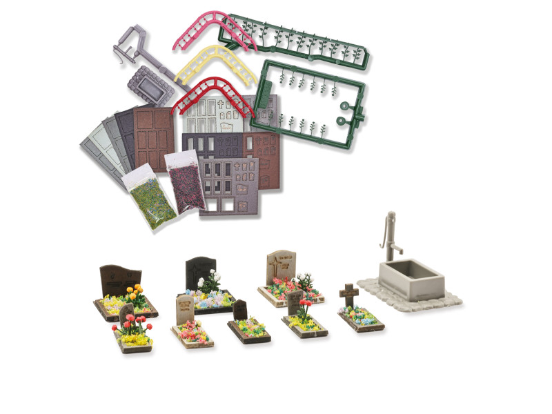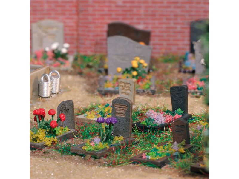Komplexní sada pro úpravu hřbitova. Obsahuje 40 náhrobků s okraji hrobu, ruční pumpu s korytem, růže, jiřiny a materiál pro výzdobu hrobů. Stavebnice. Ideální doplněk ke hřbitovu Busch 8922.