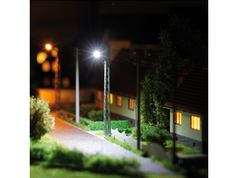 Typická průmyslová lampa, jaká se v NDR používala od 60. let 20. století a je rozšířená dodnes. Kovový příhradový stožár a izolátory na vrcholu stožáru jsou jemně navrženy. Oválný tvar svítidla je vzorem běžně používaného typu, který vyráběl bývalý závod VEB Leuchtenbau Leipzig (LBL). Bílé světlo původně vytvářely rtuťové výbojky a zde v modelu je reprodukováno pomocí bílých neonových LED. Příhradový stožár lze osadit dalšími svítidly. Hotový model.