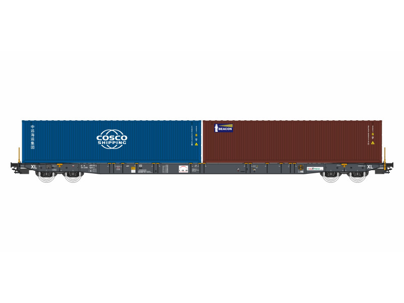 4osý 80stopý kontejnerový vůz. Ložený dvěma 40stopými kontejnery s vnitřní zátěží pro optimalizaci jízdních vlastností. S jedním kontejnerem ,,COSCO SHIPPING” a jedním kontejnerem ,,BEACON”.