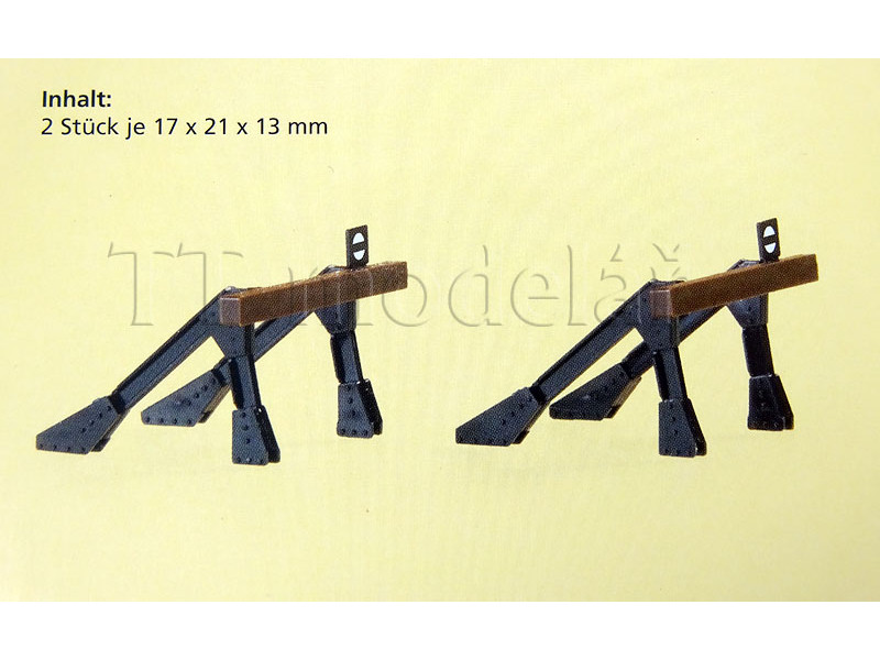 Model nárazníkového bloku vyrobeného z kolejnicových profilů přišroubovaných pomocí styčných desek. Vhodný pro různé profily kolejnice díky specifickým částem. Lze použít od II. epochy.