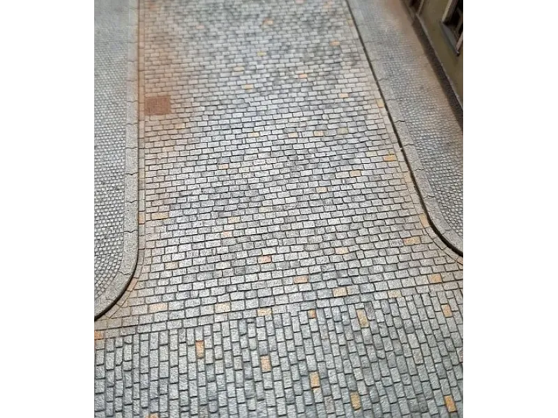 Pruhy silnice z dlažebních kostek, tzv. kočičí hlavy pro modelovou velikost H0. Šířka silnice: 77..