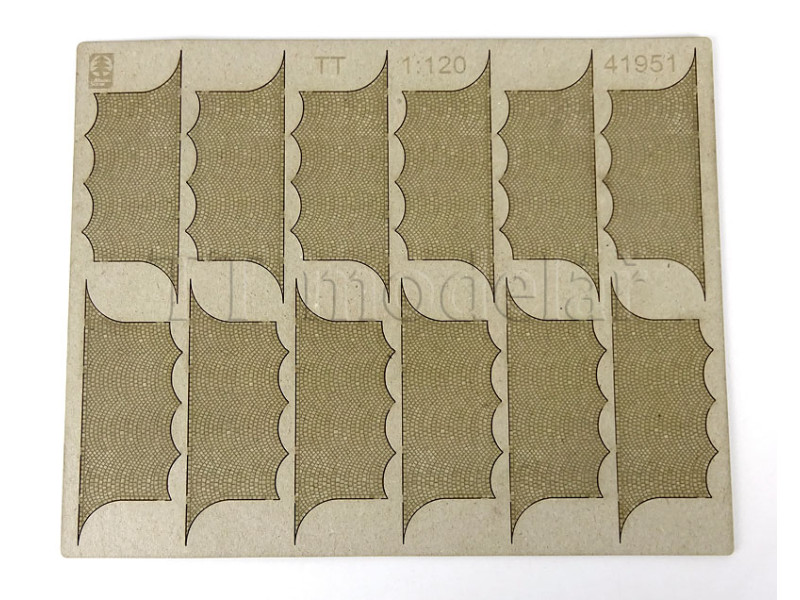 Pruhy silnice z dlažebních kostek, tzv. kočičí hlavy pro modelovou velikost TT. Šířka silnice: 59..