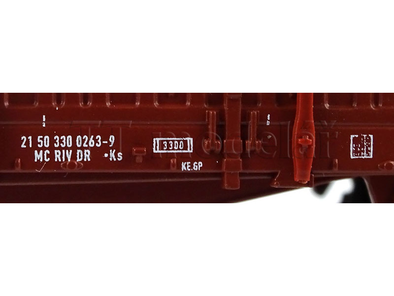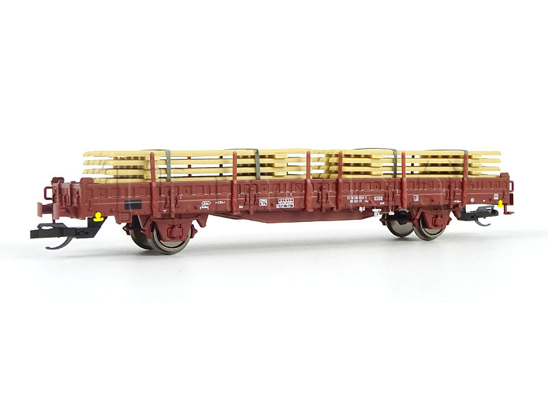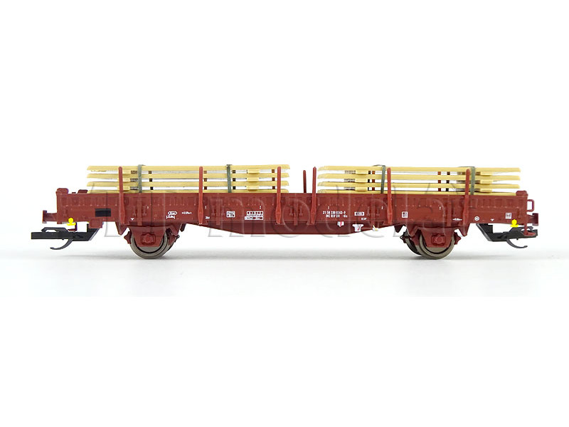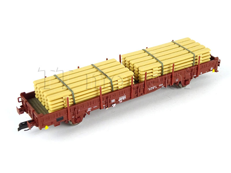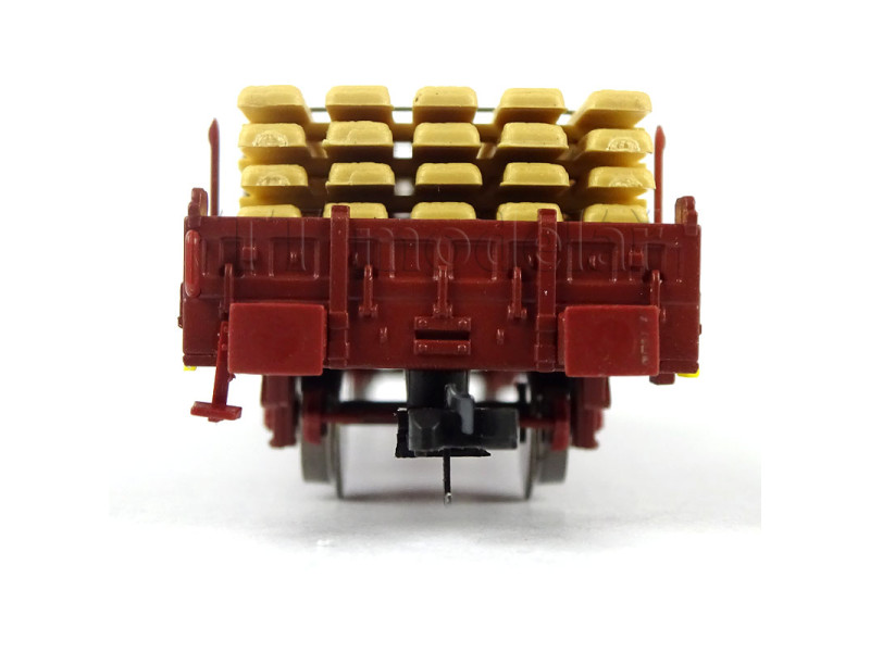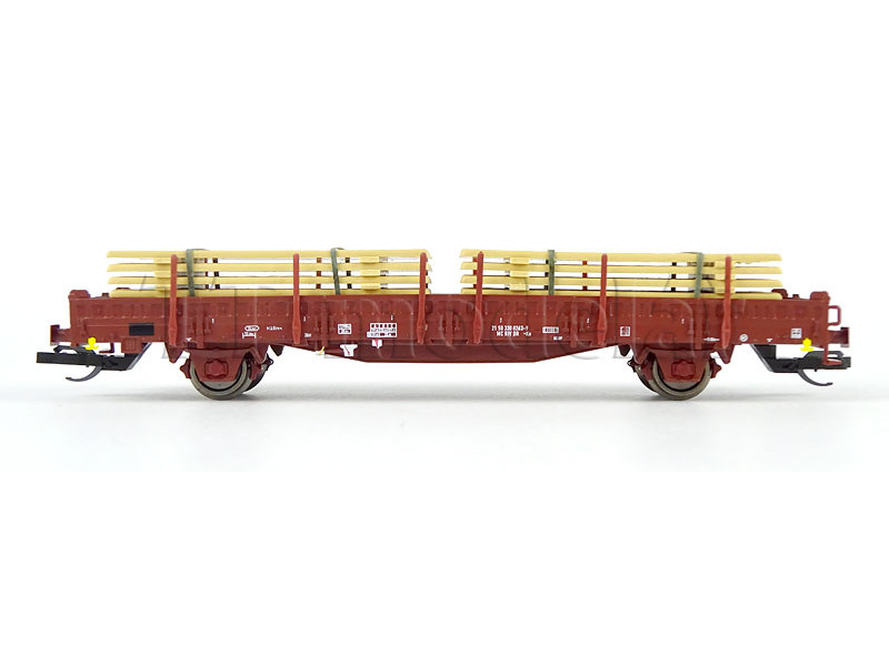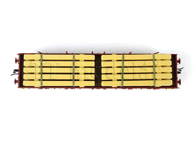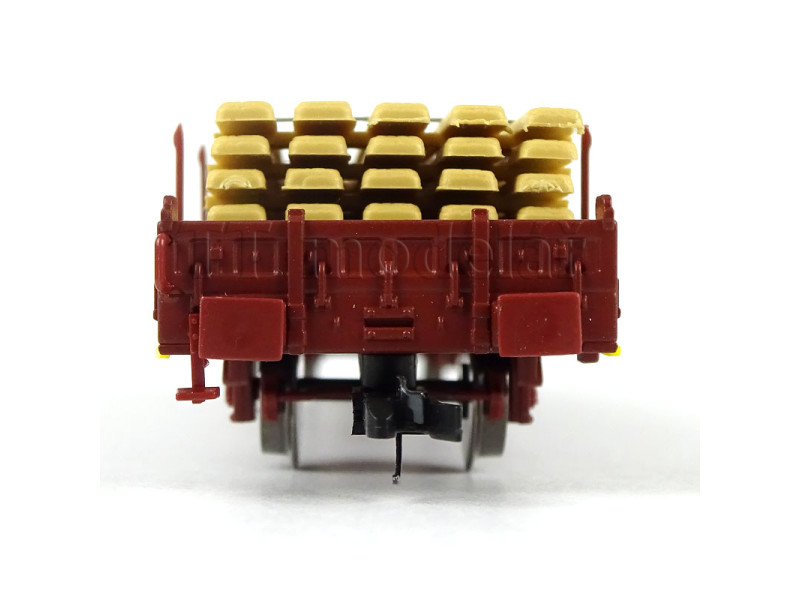 S hranatými nárazníky, ložený železnou kulatinou. Podlaha vozu je laserovaná z pravé dřevěné dýhy. ..