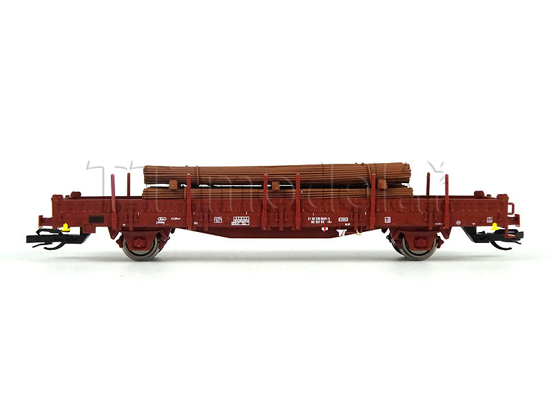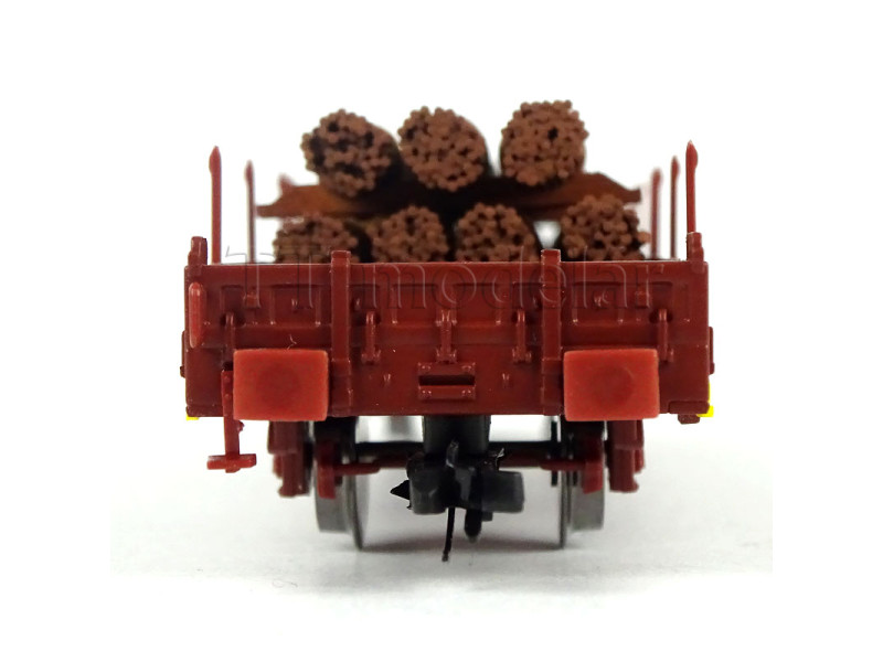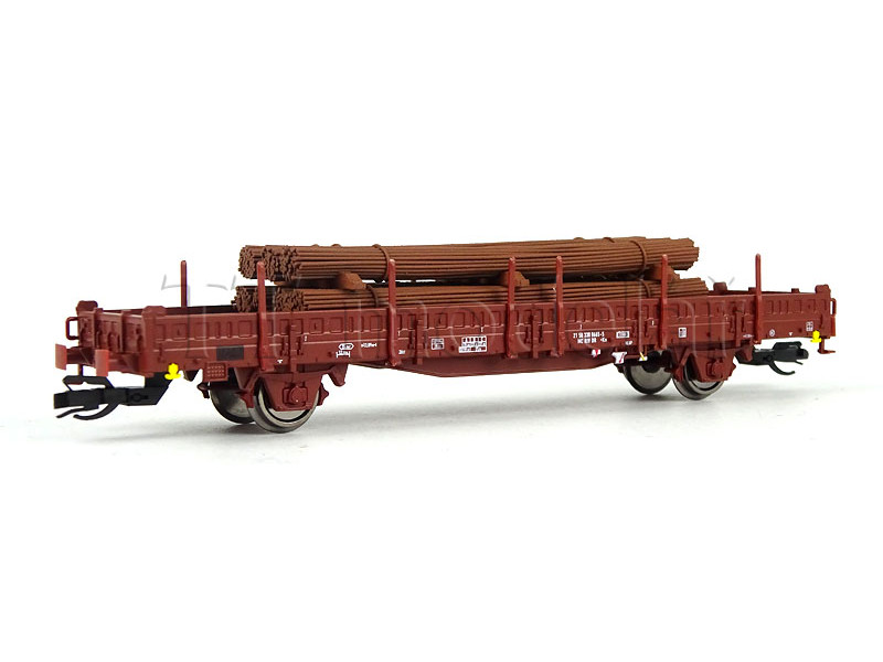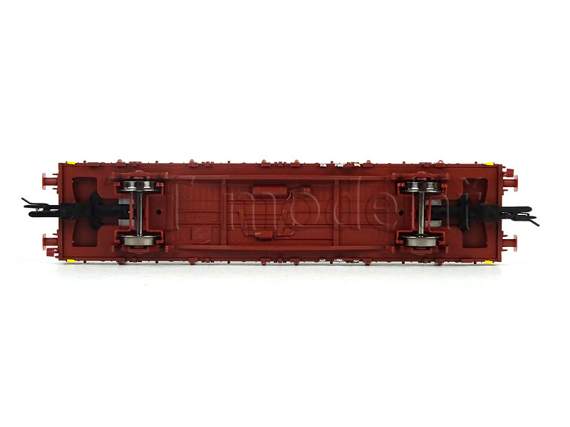 S hranatými nárazníky, ložený železnou kulatinou. Podlaha vozu je laserovaná z pravé dřevěné dýhy.