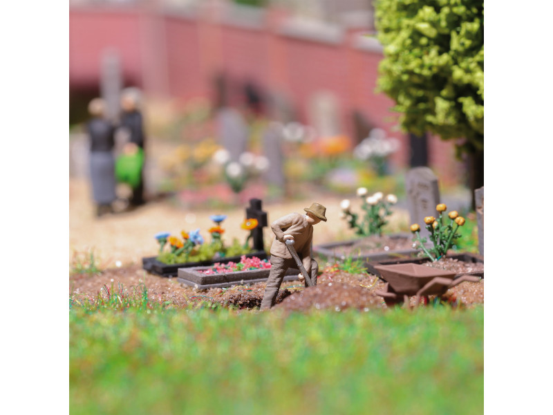 Pro realistické oživení vašeho modelového světa. Součástí jsou tematické doplňky a alespoň jedna figurka (namalovaný, hotový model) ve vhodné pozici. Velká hromada hlíny naznačuje, že hrobník již vykopal hluboký hrob. K dispozici je také trakař, koště, lopata a kbelík.