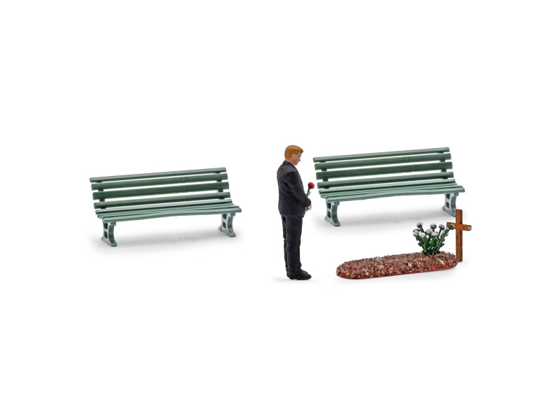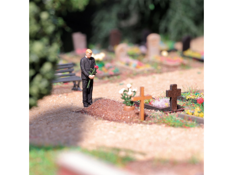 Pro realistické oživení vašeho modelového světa. Součástí jsou tematické doplňky a alespoň jedna figurka (namalovaný, hotový model) ve vhodné pozici. Muž stojí s úctou u čerstvě vykopaného hrobu a v ruce drží jedinou růži. Tato tichá scéna obsahuje jednoduchý dřevěný kříž, růžový keř a dvě lavičky.