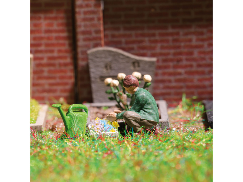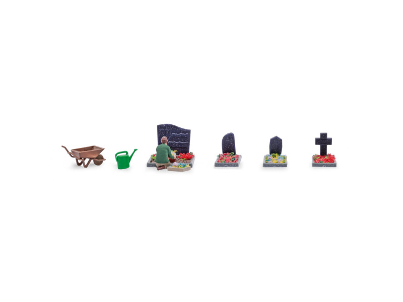 Pro realistické oživení vašeho modelového světa. Součástí jsou tematické doplňky a alespoň jedna figurka (namalovaný, hotový model) ve vhodné pozici. Zahradník už osádil čtyři hroby pestrobarevnými letními květinami. Akční sada s klečící figurkou, 4 okraji hrobu s různými náhrobky, konví na zalévání, trakařem, ručními hráběmi a materiálem pro individuální dekoraci.