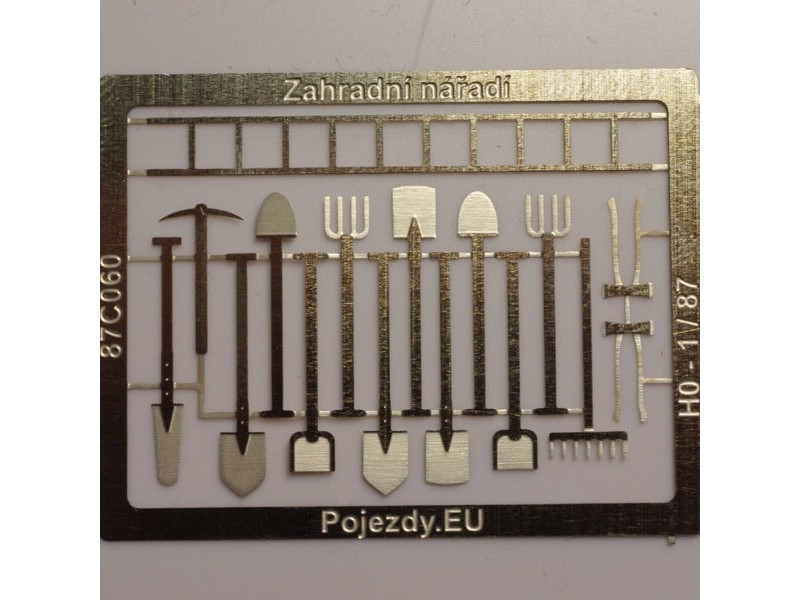 Leptaná planžeta se sadou zahradního nářadí: rýče, lopaty, hrábě, vidle, sekerky, krumpáč a žebřík.